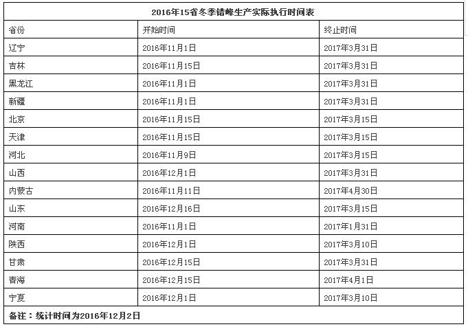 各地各企業(yè)對錯峰生產(chǎn)的重視達(dá)到了前所未有的程度,所涉及省市自治區(qū)馬上行動,很快根據(jù)各自情況,因地制宜出臺實施文件,拿出了操作性極強(qiáng)的措施,有的地區(qū)甚至細(xì)化到點明哪一家企業(yè)的哪一條生產(chǎn)線應(yīng)該關(guān)停。與此同時,各地的文件都部署了詳細(xì)的保障執(zhí)法措施和督查追責(zé)辦法。到目前為止,已經(jīng)落實2016年15省冬季錯峰生產(chǎn)實際執(zhí)行時間表: