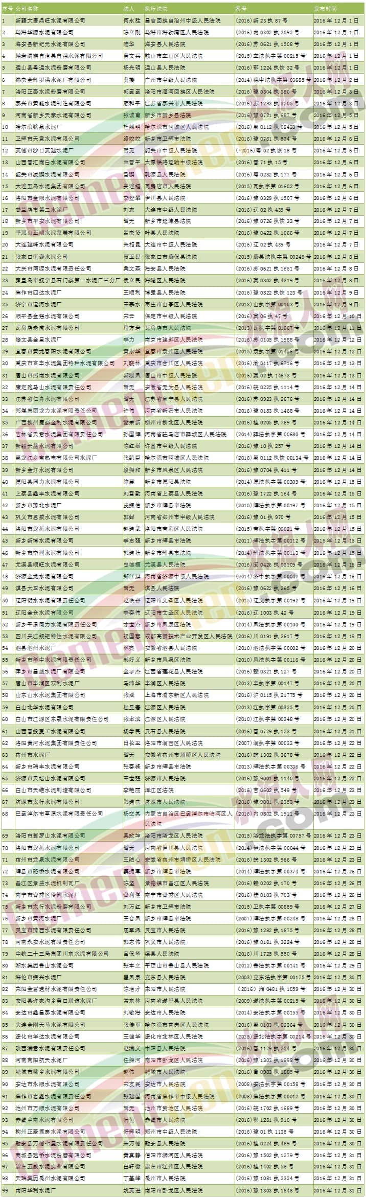 “人無忠信,不可立于世”,對于企業來說也是如此。誠信是一個企業生存和發展的基石,很多水泥企業在發展的過程中,往往把誠信看得特別重要,但是當誠信遇上利益之后,很多水泥企業都是以利為先,誠信則被完全忽視,這也是目前很多國內許多小型水泥企業無法辦強辦大的原因。據水泥人網統計,2016年12月被通報的失信水泥企業高達99家,其名單如下: