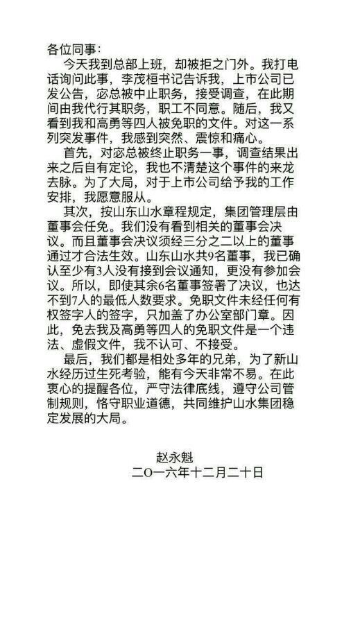 天瑞集團(tuán)控股山水水泥后,新山水水泥明顯出現(xiàn)了以老一派維權(quán)宓敬田為代表的派系與以天瑞高管為代表的山水水泥“新董事會(huì)”的爭(zhēng)斗,其內(nèi)部派系爭(zhēng)斗非常強(qiáng)烈。去年12月19日山水水泥上市公司發(fā)出公告,宓敬田因言論失職暫時(shí)免職,由趙永魁代其職,然而該公告很快又被撤銷(xiāo),取而代之的是一份對(duì)趙永魁、高勇、劉德權(quán)、趙彬的免職文件,免職理由是嚴(yán)重違反集團(tuán)基本政治紀(jì)律,破壞山水集團(tuán)穩(wěn)定發(fā)展的大局,影響惡劣。