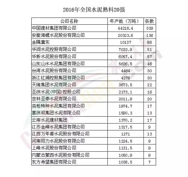 2016年是“十三五”的開局之年,也是供給側(cè)改革的元年,在這一年里,全國水泥價格開始觸底反彈,西藏水泥價格一度上漲至800元/噸左右,水泥市場價格上漲也使得很多企業(yè)2016年的業(yè)績報表比較好看。但是隨著混合所有制的逐步推進,國企、央企之間的兼并重組,使國內(nèi)水泥行業(yè)的產(chǎn)能布局發(fā)生了很大的變化。據(jù)水泥人網(wǎng)統(tǒng)計,2016年全國水泥熟料前20強企業(yè)熟料產(chǎn)能為12.1966億噸,水泥熟料生產(chǎn)線為944條。