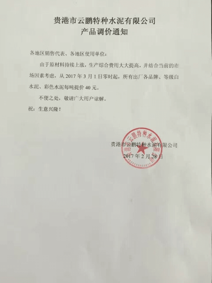 2月28日,貴港市云鵬特種水泥有限公司發布產品調價通知: