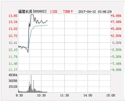 今日福建水泥(13.31 +7.25%,買(mǎi)入)開(kāi)盤(pán)報(bào)12.31元,截止10:05分,該股漲9.99%報(bào)13.65元,封上漲停板。
