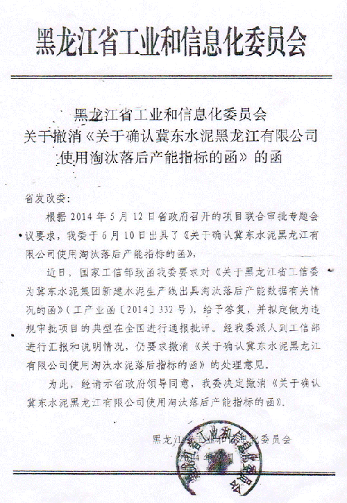 冀東水泥黑龍江新建7200t/d生產(chǎn)線項目為獲得項目批復(fù)落后產(chǎn)能置換指標(biāo)曾兩次涉嫌造假,工信部2014年9月份和2016年3月份曾兩次發(fā)函要求撤銷,并擬定做為違規(guī)審批項目的典型在全國進(jìn)行通報批評。