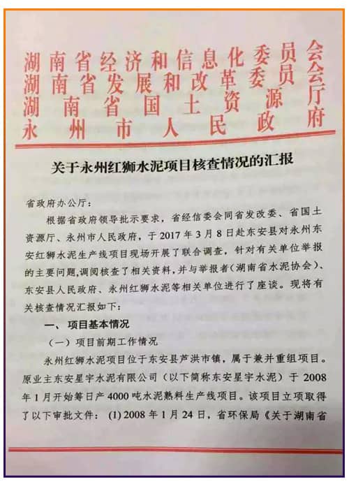 永州東安紅獅水泥新建生產線并于4月20日作出情況匯報。匯報材料針對湖南省水泥協會舉報問題逐一做了說明并給出了建議處理意見: