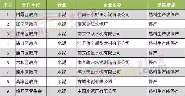 江蘇發展大會環境空氣質量保障重點管控水泥企業名單 保障措施中,熟料生產線停產企業共5家 1棲霞區:江南一小野田水泥有限公司 2 江寧區:南京中聯水泥有限公司 3浦口區:江蘇信寧新型建材有限公司 4溧水區:溧水天山水泥有限公司 5市開發區:中國水泥廠有限公司 被通知停產水泥企業共4家: 1 江寧區:南京金江水泥廠 2浦口區:南京江星水泥有限公司 3 六和區:南京雄州水泥制造有限公司 4高淳區:古城水泥有限公司 江蘇發展大會環境空氣質量保障重點管控 水泥熟料企業名單