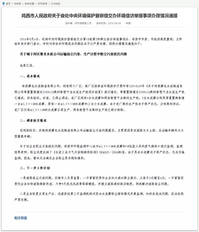 而對(duì)于雞西賽龍水泥是否涉嫌違規(guī)生產(chǎn),環(huán)保局相關(guān)負(fù)責(zé)人稱(chēng):環(huán)保局只負(fù)責(zé)環(huán)保問(wèn)題,針對(duì)雞西賽龍水泥環(huán)境污染的問(wèn)題在2016年曾向國(guó)家環(huán)保督查組做過(guò)匯報(bào),主要問(wèn)題在于工廠進(jìn)出車(chē)輛導(dǎo)致的道路揚(yáng)塵污染。針對(duì)此問(wèn)題雞西市環(huán)保局對(duì)企業(yè)做了簡(jiǎn)單的處罰。