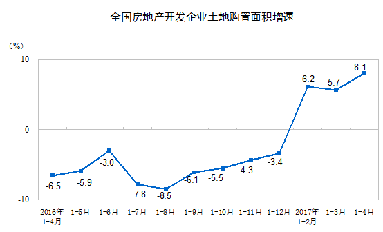 1-4月份,房地產開發企業土地購置面積5528萬平方米,同比增長8.1%,增速比1-3月份提高2.4個百分點;土地成交價款2104億元,增長34.2%,增速提高17.5個百分點。