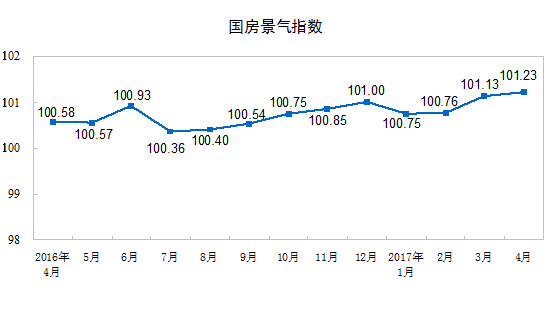 4月份,房地產開發景氣指數(簡稱“國房景氣指數”)為101.23,比3月份提高0.10點。