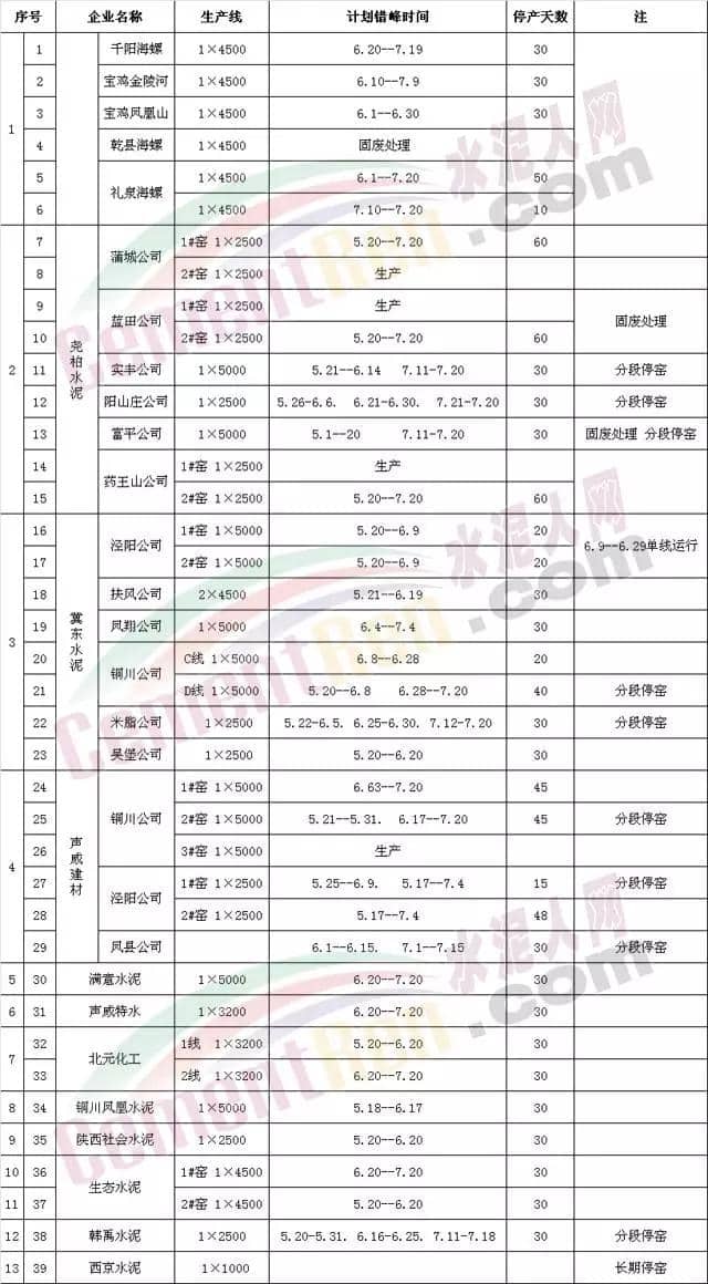 本次錯(cuò)峰停產(chǎn)涉及海螺水泥下屬5家企業(yè),共6條生產(chǎn)線;堯柏水泥下屬6家企業(yè)共9條熟料生產(chǎn)線;冀東水泥下屬6家企業(yè)共9條熟料生產(chǎn)線;聲威建材下屬3家企業(yè)共6條生產(chǎn)線;陜西滿(mǎn)意水泥有限責(zé)任公司 1條生產(chǎn)線、銅川聲威特種水泥有限公司 1條生產(chǎn)線、北元化工集團(tuán)水泥公司2條生產(chǎn)線、陜西銅川鳳凰建材有限公司1條生產(chǎn)線、陜西社會(huì)水泥有限責(zé)任公司1條生產(chǎn)線、陜西生態(tài)水泥股份有限公司2條生產(chǎn)線、韓城韓禹建材礦業(yè)有限責(zé)任公司1條生產(chǎn)線。西安西京水泥有限責(zé)任公司一條日產(chǎn)1000噸生產(chǎn)線長(zhǎng)期停產(chǎn)。