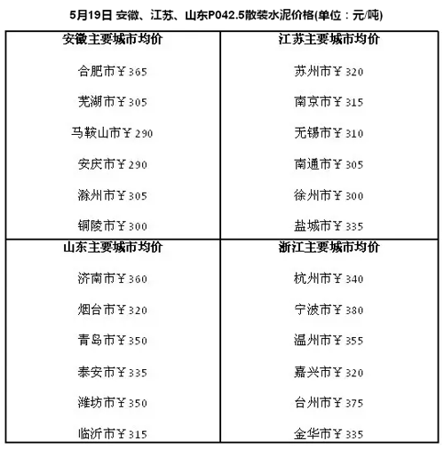 據(jù)了解,長(zhǎng)三角沿江熟料價(jià)格上漲20元/噸,漲幅達(dá)到80-90元/噸,出廠價(jià)達(dá)320元/噸-340元/噸,這是今年來沿江熟料價(jià)格第四次漲價(jià)。此輪漲價(jià)在市場(chǎng)意料之外,明顯超預(yù)期。由于沿江熟料價(jià)格是華東地區(qū)水泥價(jià)格的風(fēng)向標(biāo),預(yù)計(jì)在今年6月淡季來臨前,安徽、山東、江蘇和浙江的水泥價(jià)格有望再跟隨熟料價(jià)格普漲一輪。水泥人網(wǎng)匯總了這些地區(qū)的最新價(jià)格,匯總?cè)缦拢?/p>