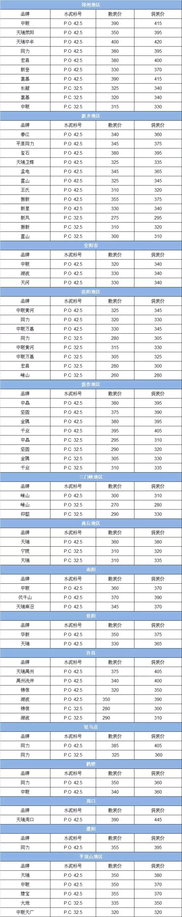 附: 河南省區(qū)域水泥市場近期價(jià)格一覽