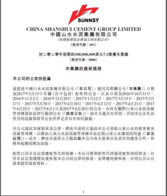 山水水泥(00691)8月8日晚間披露公司最新進(jìn)展,濟(jì)南市政府正協(xié)助公司重組山東山水的董事會及管理層,以解決山東山水前高級管理層非法占領(lǐng)山東山水總部的問題。此外,濟(jì)南市政府正主動鼓勵(lì)公司各方股東以負(fù)責(zé)任的態(tài)度解決糾紛。