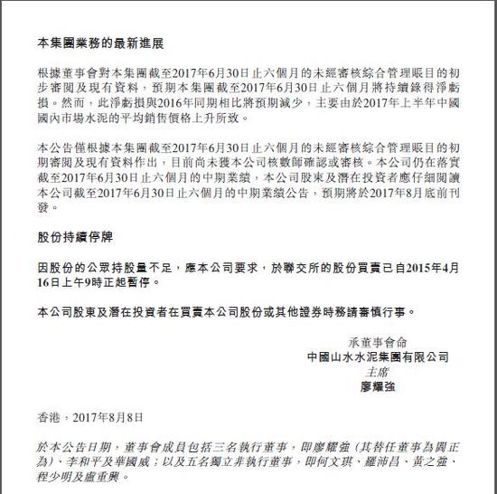 另外,公司配售已因非法占領(lǐng)遭延遲。公司將與配售代理協(xié)商時(shí)間表,以待非法占領(lǐng)獲解決后恢復(fù)公司的公眾持股量。公司因公眾持股量不足,已自2015年4月16日停牌至今。