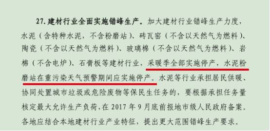 水泥等行業承擔居民供暖、協同處置城市垃圾或危險廢物等保民生任務的,要根據承擔任務量核定最大允許生產負荷,在2017年9月底前報地市級人民政府備案。各地應結合本地建材行業產業特征,提出更大范圍錯峰生產要求。