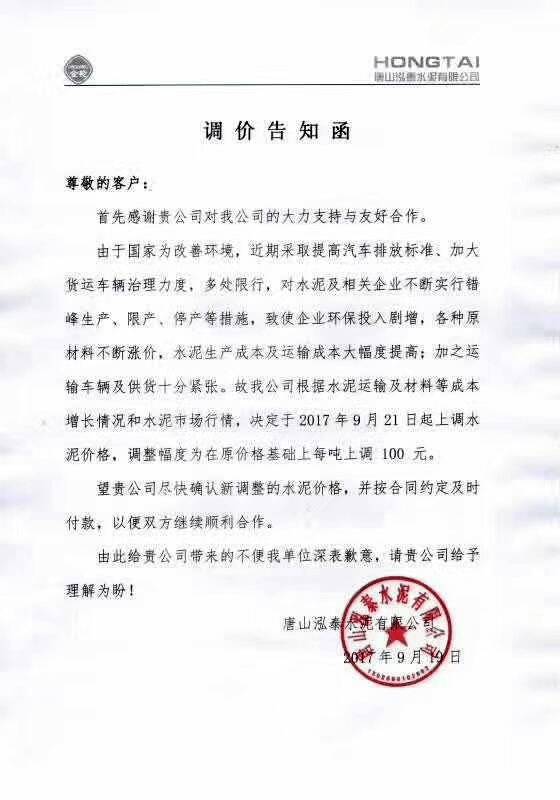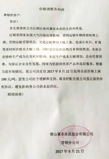 企業(yè)價(jià)格調(diào)整告知函稱:由于天津地區(qū)企業(yè)環(huán)保投入加大以及生產(chǎn)水泥的煤炭、礦粉等原燃材料漲價(jià),造成了水泥成本的大幅上漲。