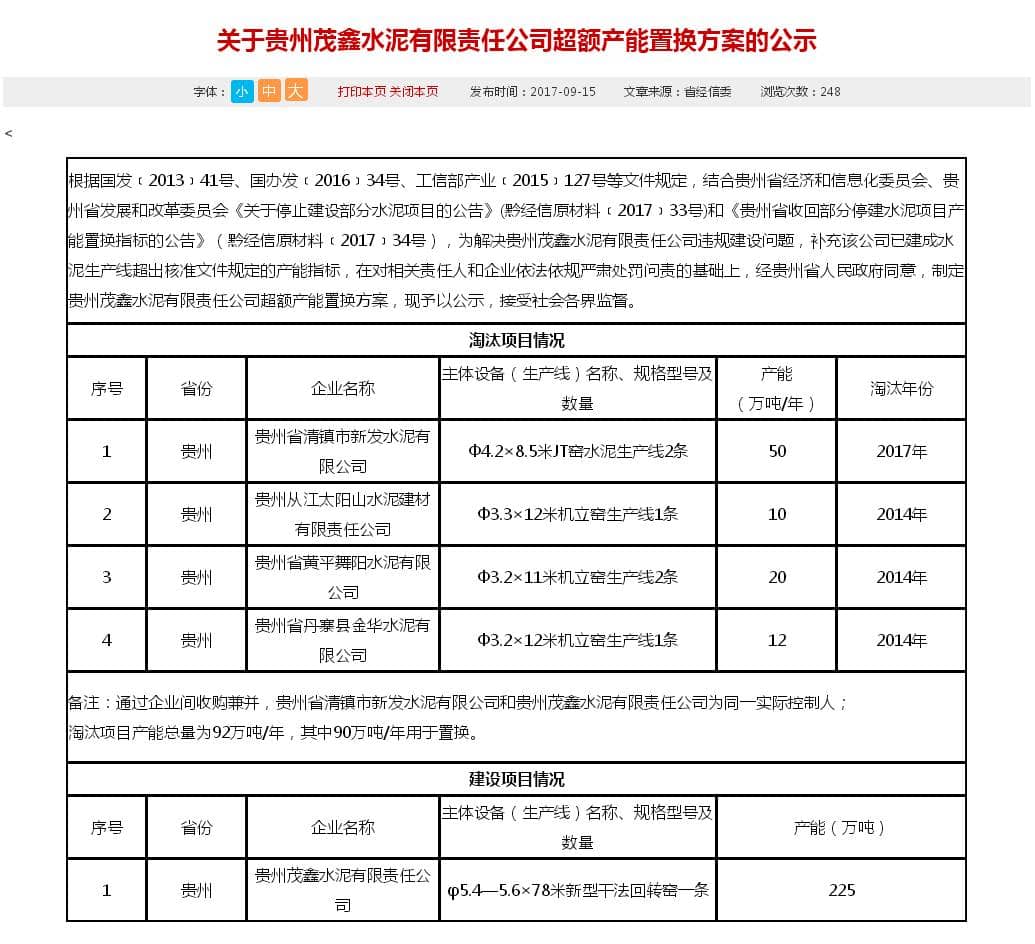 2017年9月15日,貴州省經信委在網站發(fā)布了《關于對貴州茂鑫水泥有限責任公司超額產能置換方案的公示》。公示方案中,拿出了貴州省在2013年—2017年之間淘汰的4家立窯企業(yè),共計92萬噸水泥產能,來置換貴州茂鑫水泥公司違規(guī)超額的熟料產能。并且在公示前言中說明:“為解決貴州茂鑫水泥有限責任公司違規(guī)建設問題,補充該公司已建成水泥生產線超出核準文件規(guī)定的產能指標,在對相關責任人和企業(yè)依法依規(guī)嚴肅處罰問責的基礎上,經貴州省人民政府同意,制定貴州茂鑫水泥有限責任公司超額產能置換方案,現予以公示,接受社會各界監(jiān)督。”