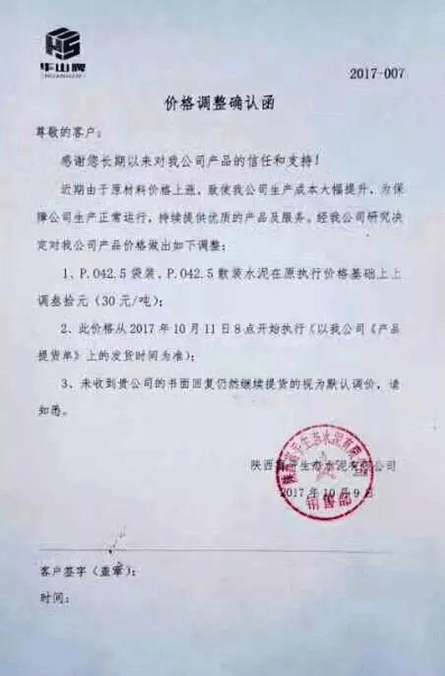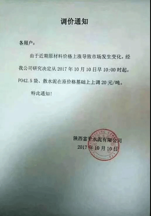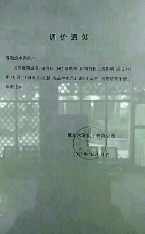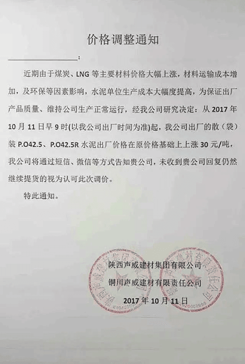 說(shuō)到水泥價(jià)格,不能不提水泥的上游產(chǎn)品煤炭,陜西水泥企業(yè)的調(diào)價(jià)通知稱:“由于煤碳、LNG等主要材料價(jià)格大幅上漲,材料運(yùn)輸成本增加及環(huán)保等因素影響,水泥單位生產(chǎn)成本大幅提高,為保證出廠產(chǎn)品質(zhì)量、維持公司生產(chǎn)正常運(yùn)行,經(jīng)公司研究決定從2017年10月11日早9時(shí)起,公司出廠的散(袋)裝P.O42.5、P.O42.5R水泥出廠價(jià)格在原價(jià)格基礎(chǔ)上上漲30元/噸。”