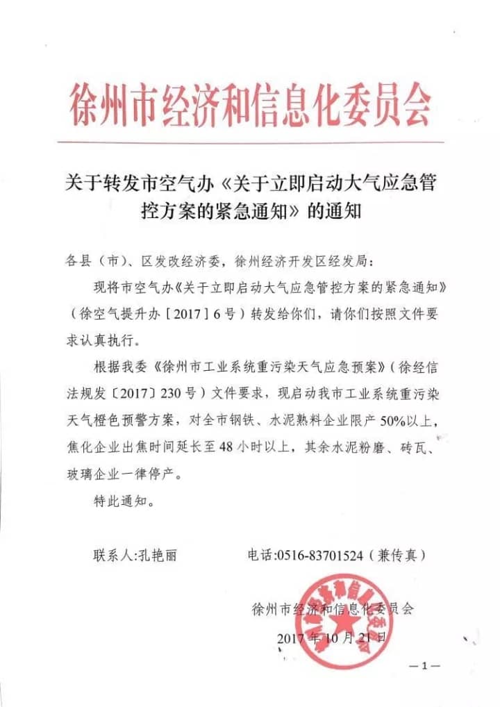 通知稱,根據徐州市經信委《徐州工業系統重污染天氣應急預案》(徐經信法規發【2017】230號)文件要求,啟動徐州工業系統重污染天氣橙色預警方案,對全市鋼鐵、水泥熟料企業限產50%以上,焦化企業出焦長至48小時以上,其余水泥粉磨、磚瓦、玻璃企業一律停產。