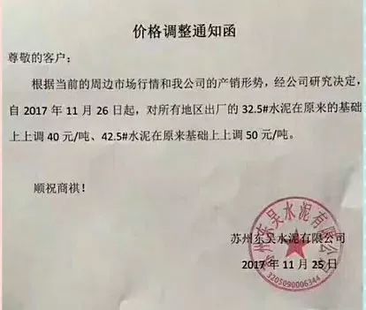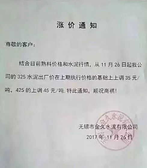 無錫金久水泥漲價函
