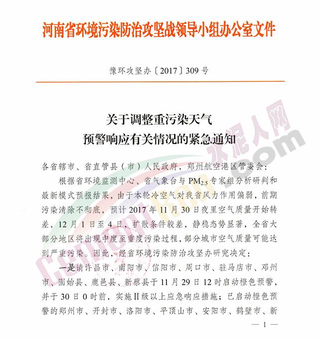 自水泥人網10月30日發布《河南省七十四家水泥企業停限產方案(含特種水泥名單)》(點擊閱讀)后,河北省多區域水泥企業也將再現集體停產。河南省環境污染防治攻堅戰領導小組辦公室于近日發布《關于調整重污染天氣預警響應有關情況的緊急通知》稱:根據河南省環境監測中心、省氣象臺與PM2.5專家組分析研判和最新模式預報結果,預計2017年11月30日夜里空氣質量開始轉差,12月1日至4日,擴散條件較差,靜穩態勢顯著,全省大部分地區將出現中度至重度污染過程,部分城市空氣質量可能達到嚴重污染。因此,經省環境污染防治攻堅辦研究決定: