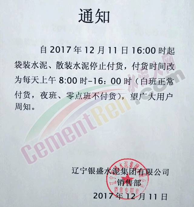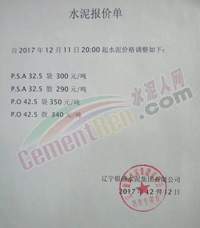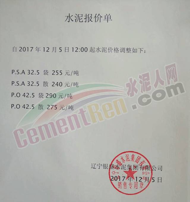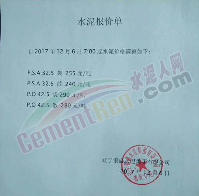 12月11日通知稱,根據市場行情,從11日起福建金牛(含子公司)水泥出廠單價:銷往三明市區、沙縣、永安、明溪、清流、寧化、長汀、將樂、泰寧、建寧、順昌片區袋裝各規格水泥出廠價在現行價格基礎上上調20元/噸,各規格散裝水泥上調30元/噸。銷往石城、寧都、瑞金片區袋裝各規格水泥出廠價在現行價格基礎上上調50元/噸、散裝各規格水泥上調40元/噸。其中石城縣源達建材有限公司袋裝各規格上調45元/噸,散裝各規格上調35元/噸。