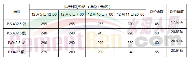 福建金牛水泥有限公司進入12月份已陸續幾次發布提價通知,全面調整各區域出貨價格。各品種水泥上調幅度在20-40元/噸左右。