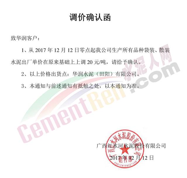 昨日(12日)廣西紅水河水泥股份有限公司發布調價確認函稱,從零點起所有品種水泥出廠單價在原基礎上上調20元/噸。