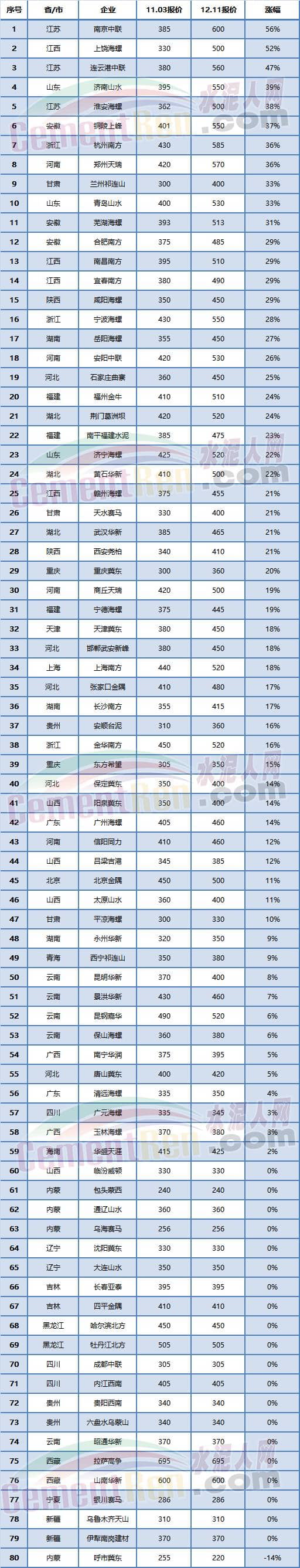 以上80家水泥企業,僅內蒙古呼和浩特冀東水泥不漲反降,降幅14%。據水泥人網了解,內蒙古呼浩和特市冀東水泥公司生產部將于近期放假,PO42.5散裝水泥220元/噸的價格將持續到2018年3月15日開窯以后。