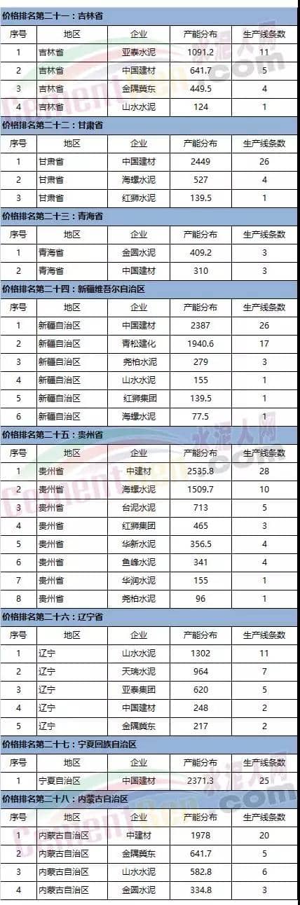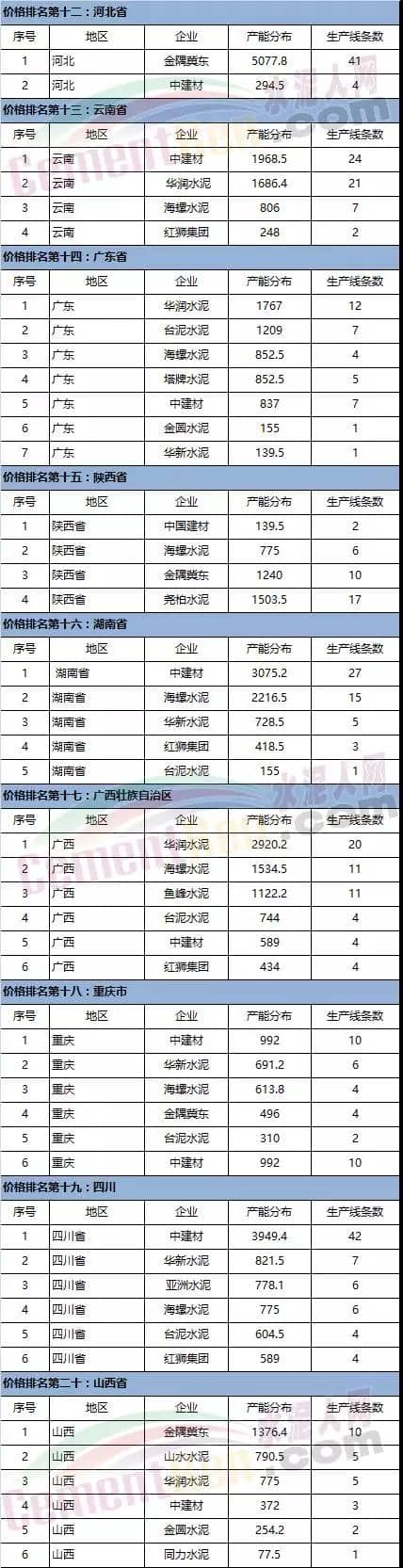 備注:以上數據來源于水泥人網信息中心,相關數據為人工采集多為設計產能如與實際不符請以實際為準。