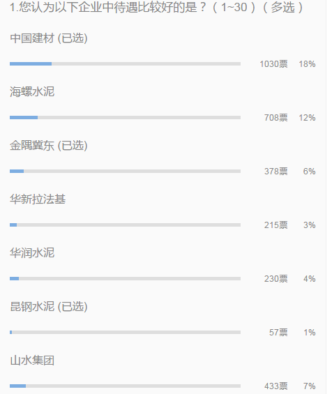 2017年12月15日,水泥人網(wǎng)發(fā)起“您認(rèn)為以下企業(yè)中待遇比較好的是?”民調(diào)活動(dòng),通過7天的網(wǎng)絡(luò)投票,武安新峰水泥以1162票勝出,據(jù)了解,武安新峰水泥每月工資按時(shí)足額發(fā)放,武安新峰不僅是花園式的企業(yè),也是工資加管理的一流企業(yè),福利高,還有機(jī)會(huì)出國。可以看出員工對企業(yè)的信賴度之高,為這家企業(yè)點(diǎn)贊。