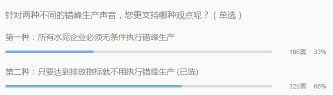 但是在水泥人網(wǎng)針對兩種不同聲音的民調(diào)結(jié)果顯示,大部分人認(rèn)為只要排放達(dá)標(biāo)可不執(zhí)行錯(cuò)峰生產(chǎn)更符合行業(yè)的發(fā)展,避免水泥行業(yè)出現(xiàn)吃大鍋飯的現(xiàn)象,更能有效的提升各大水泥企業(yè)的節(jié)能減排,達(dá)到真正的綠色發(fā)展。