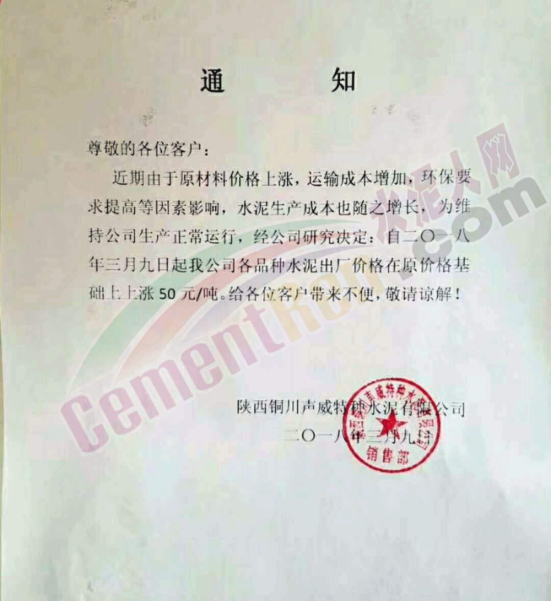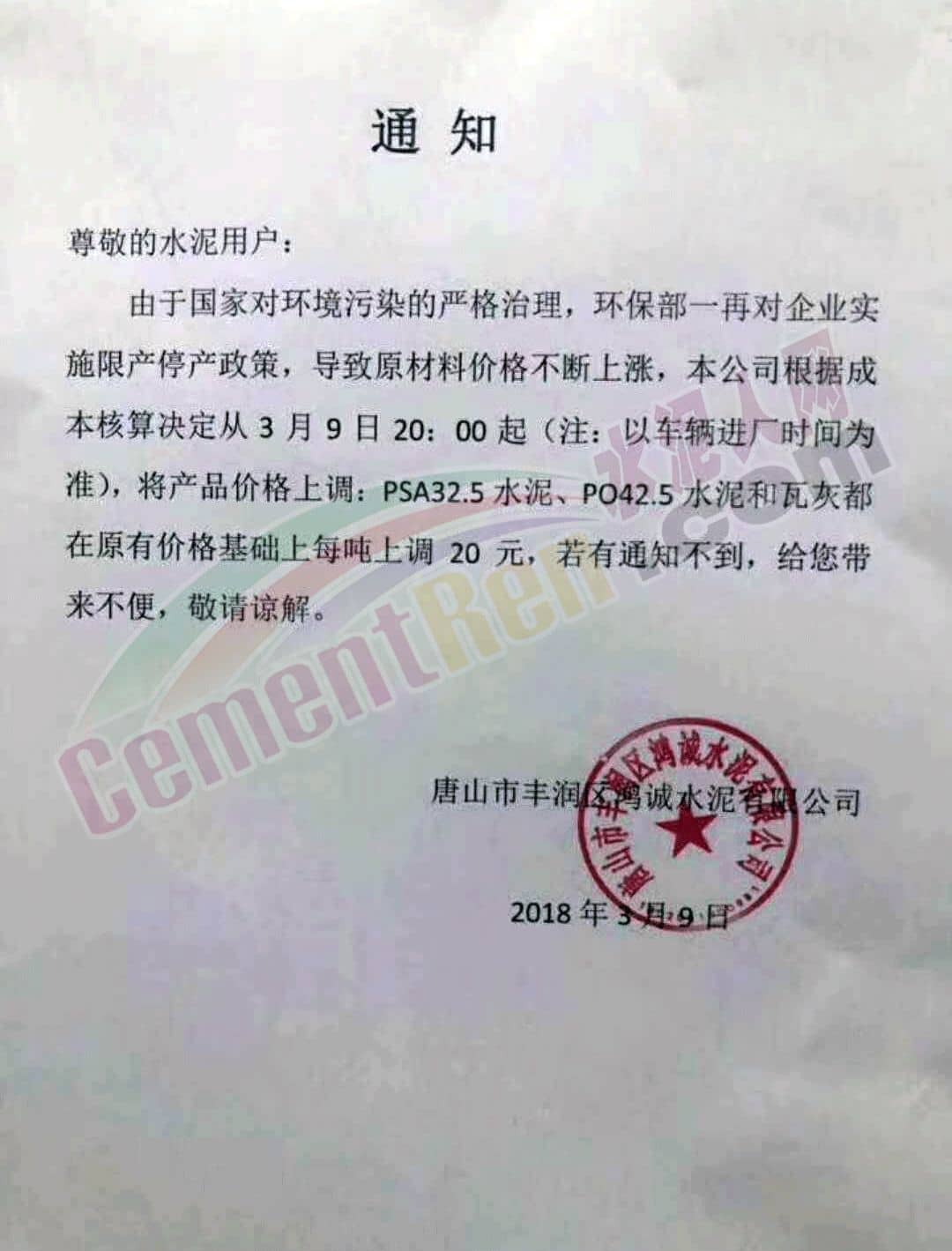 3月9日唐山市豐潤(rùn)區(qū)鴻誠(chéng)水泥有限公司發(fā)布通知稱由于國(guó)家對(duì)環(huán)境污染的嚴(yán)格治理,環(huán)保部一再對(duì)企業(yè)實(shí)施限產(chǎn)停產(chǎn)政策,導(dǎo)致原材料價(jià)格不斷上漲,公司根據(jù)成本核算決定自3月9日20:00起水泥價(jià)格在原有價(jià)格基礎(chǔ)上上調(diào)20元/噸。