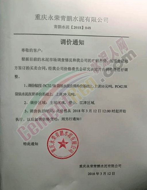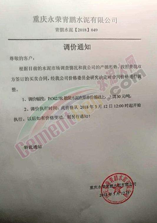 3月12日,重慶永榮青鵬水泥有限公司通知針對(duì)同重慶市不同地區(qū)水泥價(jià)格上調(diào)10-50元/噸。