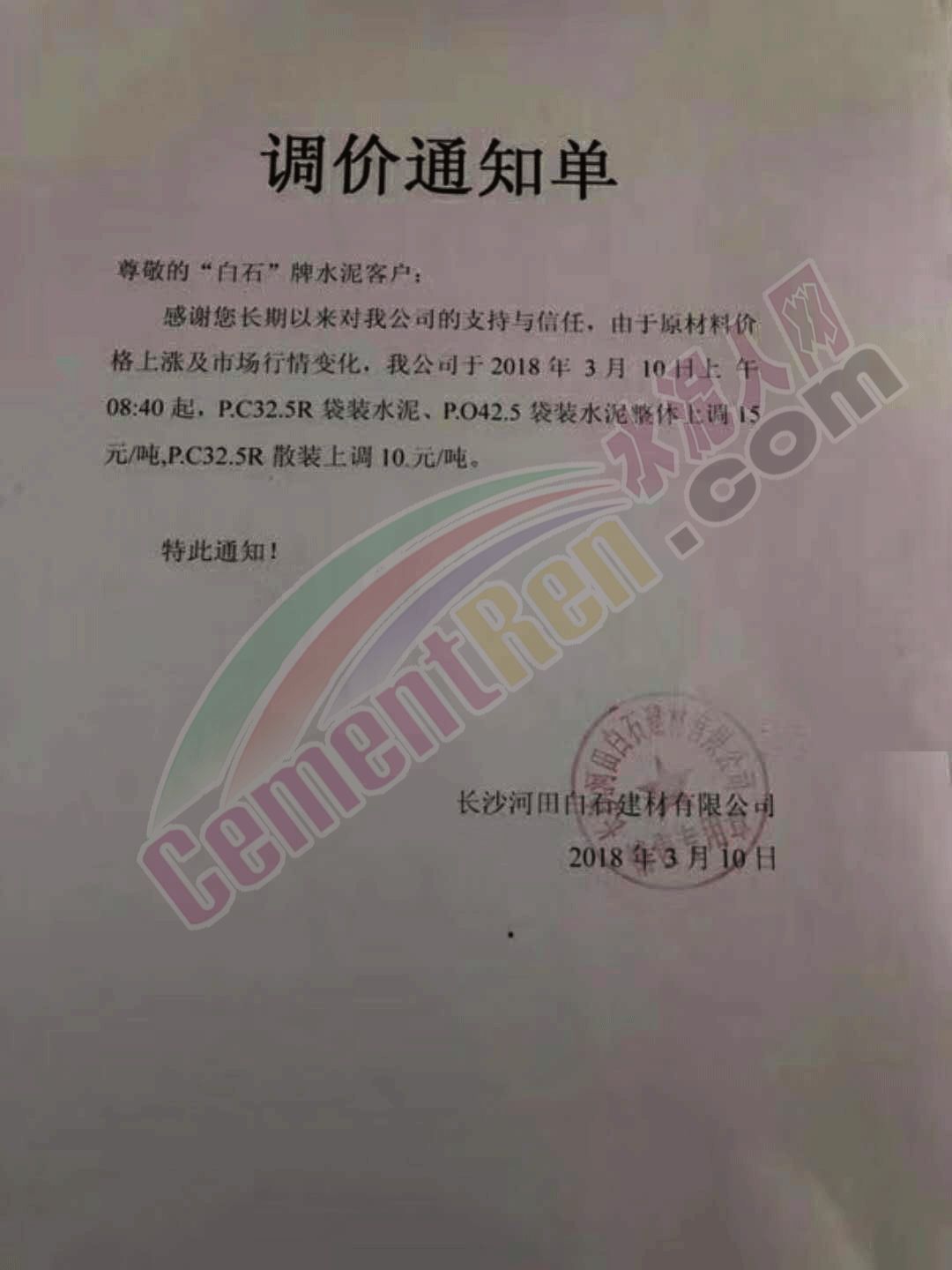 長(zhǎng)沙河田白石建材有限公司通知3月10日起對(duì)旗下袋裝水泥整體上調(diào)15元/噸,P.C32.5R散裝水泥上調(diào)10元/噸。