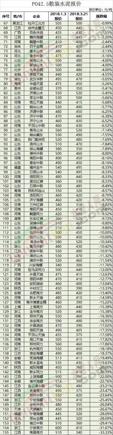 以上數(shù)據(jù)顯示自本年度1月份以來(lái),內(nèi)蒙、遼寧、黑龍江、湖南、陜西、甘肅、新疆、廣東、廣西、云南、重慶、 河北、河南等省自治區(qū)水泥價(jià)格均有上調(diào),上調(diào)幅度最高為45%以上。