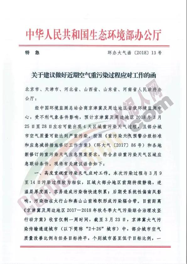 公函文件稱,預計京津冀及周邊地區2018年3月25日28日左右可能現4天區域重污染天氣過程,且部分城市空氣質量可能達到嚴懲污染。建議北京市、天津市、河北省、山西省、山東省、河南省等高度重視重污染天氣應對工作。
