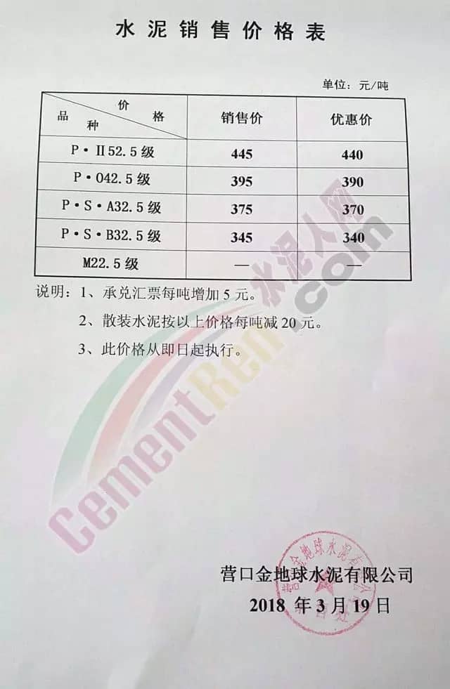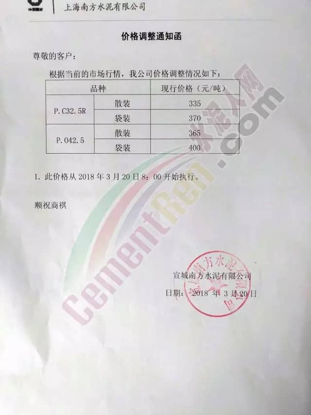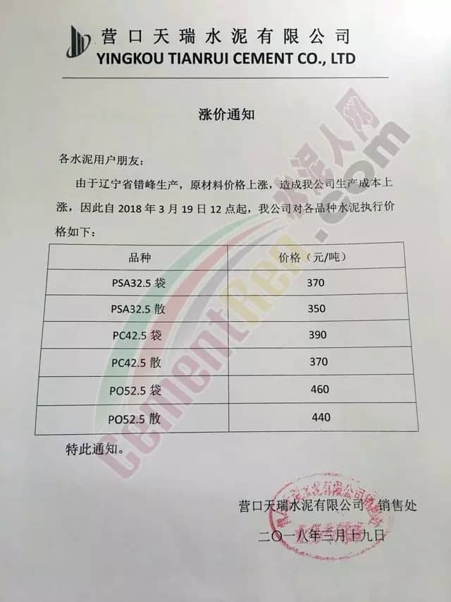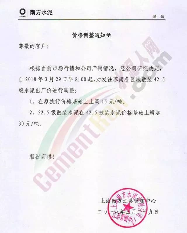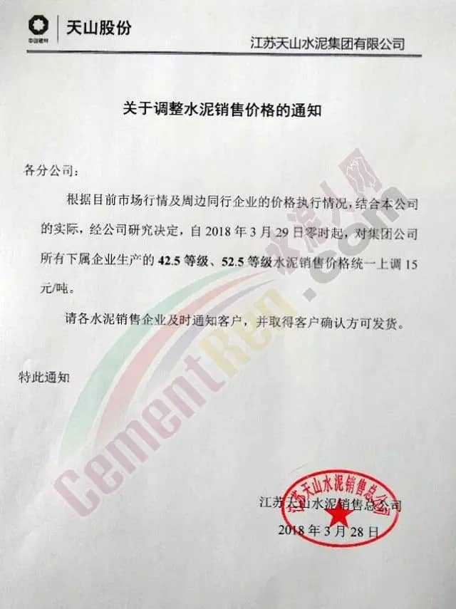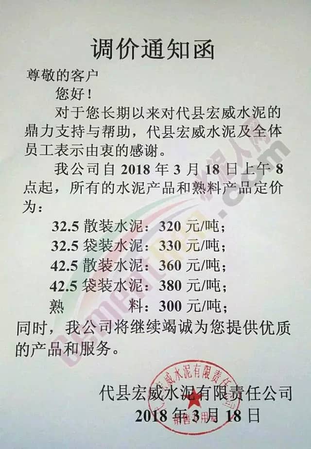 經公司研究決定,自2018年3月28日零時起,所有散裝水泥在現有結算價基礎上,上調10元/噸。
