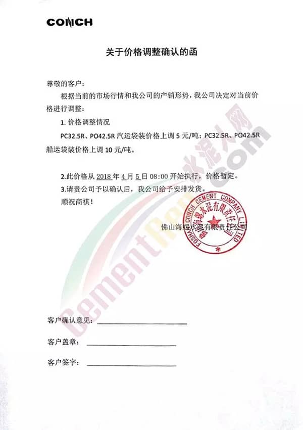 佛山海螺水泥調(diào)價(jià)函