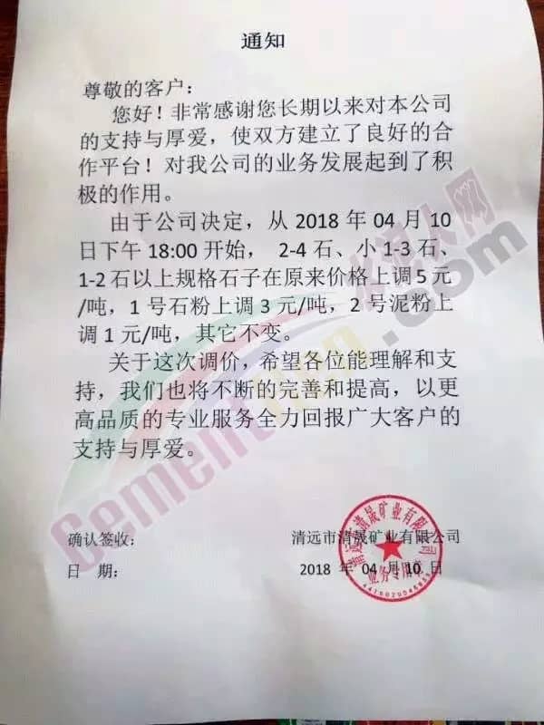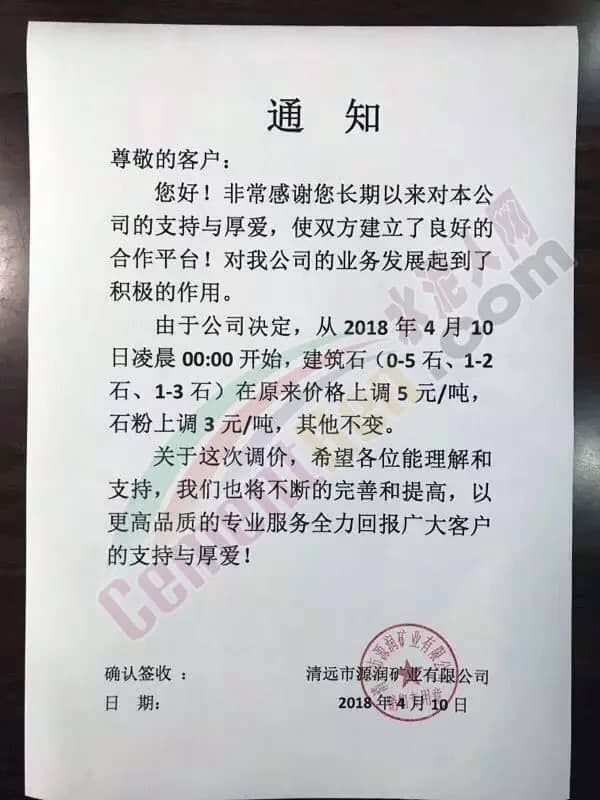 清遠(yuǎn)市源潤(rùn)礦業(yè)有限公司、清遠(yuǎn)市清晟礦業(yè)有限公司等發(fā)布提價(jià)通知,通知自今日(10日)起,上調(diào)建筑石和石粉價(jià)格。