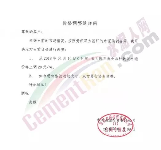 華潤(rùn) 散裝水泥調(diào)價(jià)