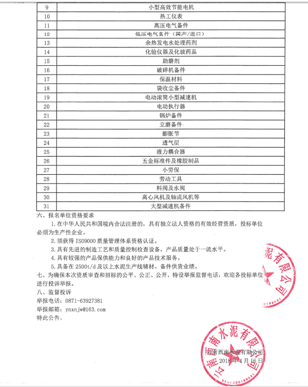 【水泥人網(wǎng)】云南西南水泥有限公司(以下簡(jiǎn)稱云南西南)成立于2012年3月,注冊(cè)資本金20億元,總部設(shè)于云南省昆明市呈貢新區(qū),下屬成員企業(yè)19家,遍布云南省昆明、曲靖、普洱、麗江、文山、德宏等市州及四川省攀枝花市,現(xiàn)擁有代表國內(nèi)先進(jìn)水平的日產(chǎn)熟料5000噸、4000噸、3200噸、2500噸等新型干法水泥生產(chǎn)線26條,水泥年產(chǎn)能逾2300萬噸,規(guī)模位居全省水泥企業(yè)第二位。云南西南目前資產(chǎn)總額達(dá)145億元,擁有干部員工3900余人。云南西南秉承“善用資源、服務(wù)建設(shè)”的核心理念和“創(chuàng)新、績(jī)效、和諧、責(zé)任”的核心價(jià)值觀,努力創(chuàng)建“創(chuàng)新績(jī)效型、資源節(jié)約型、環(huán)境友好型、社會(huì)責(zé)任型”的“四型企業(yè)”,著力發(fā)展成為云南省水泥行業(yè)規(guī)模領(lǐng)先、技術(shù)先進(jìn)、管理優(yōu)秀、效益一流的專業(yè)化水泥企業(yè)。為了做好云南西南下屬19家成員企業(yè)2017年度生產(chǎn)用第二批輔材備件集中采購的招議標(biāo)工作,誠邀云南西南下屬19家成員企業(yè)的機(jī)電設(shè)備原制造供貨廠及其它同類制造企業(yè)參加,以滿足云南西南下屬成員企業(yè)生產(chǎn)的機(jī)電設(shè)備備件及輔助材料的需求,共同打造云南西南長(zhǎng)期穩(wěn)定合作、互惠共贏的供應(yīng)商渠道。現(xiàn)將相關(guān)招標(biāo)采購信息發(fā)布如下: