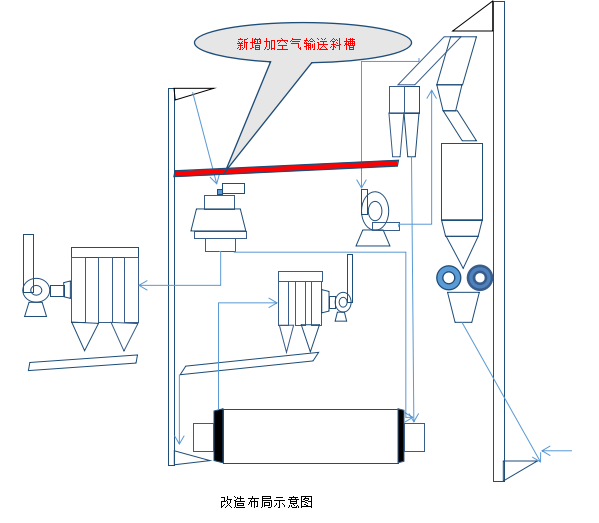 根據(jù)1#磨系統(tǒng)的旋風(fēng)筒(雙筒)收集的物料分析,有30-40%的成品進入磨內(nèi)再粉磨,形成了磨機過粉磨現(xiàn)象。對旋風(fēng)筒(雙筒)的物料走向進行改造,把兩個旋風(fēng)筒其中的一個用斜槽把物料送到磨尾斗提進入選粉機進行選粉,(由于受磨尾500斗提提料能力的制約,暫對一個旋風(fēng)筒的物料接斜槽改入磨尾500斗提,)直接經(jīng)選粉機進入成品。