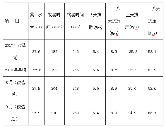 從上表看出:改造前后需水量增加了0.3%,二十八天強度增加了1.6Mpa,其他檢驗項目性能變化不大。