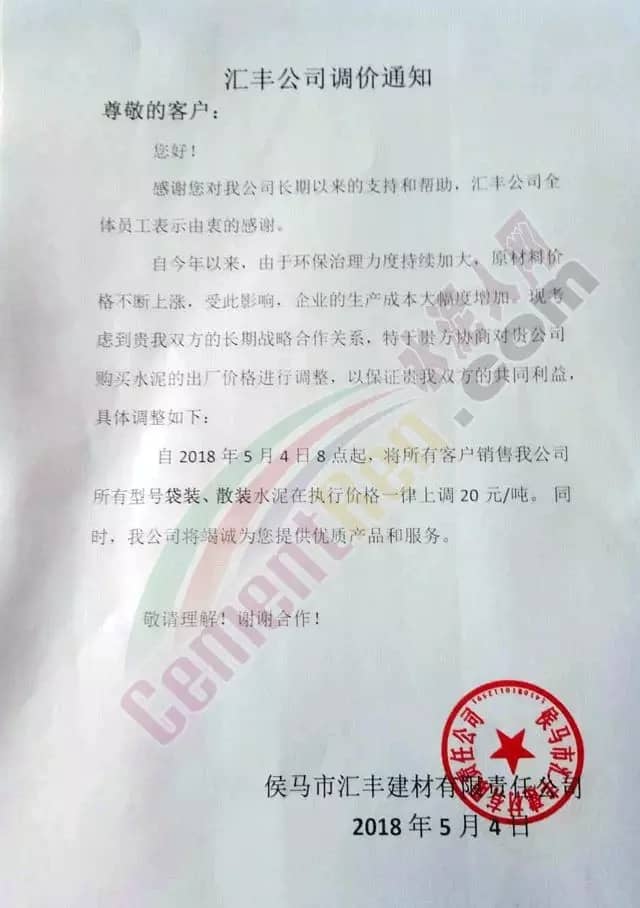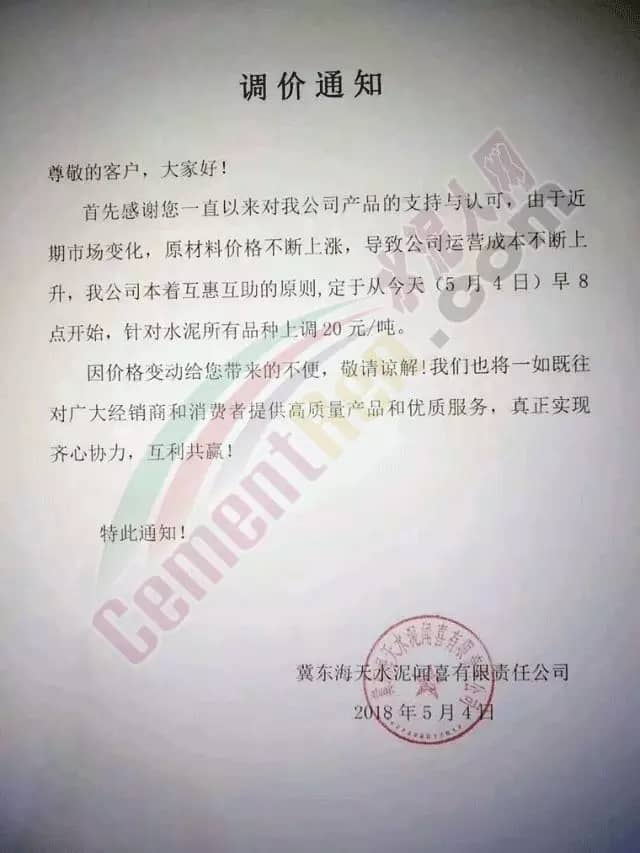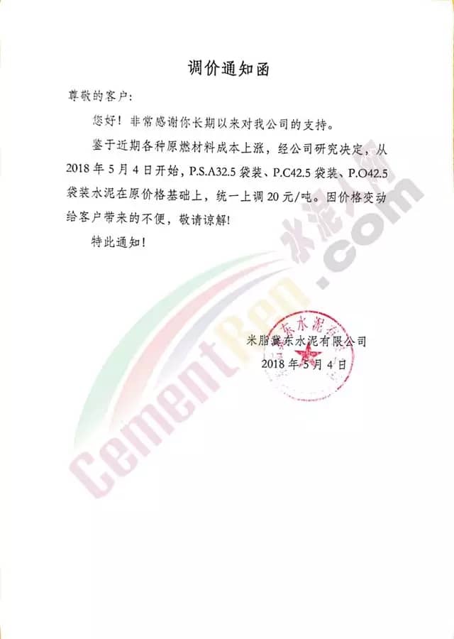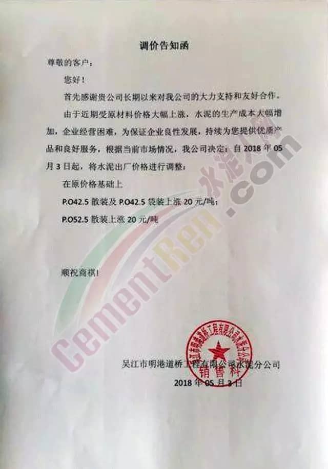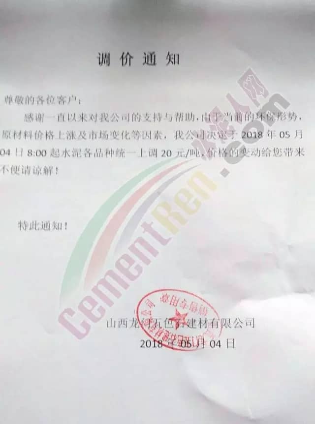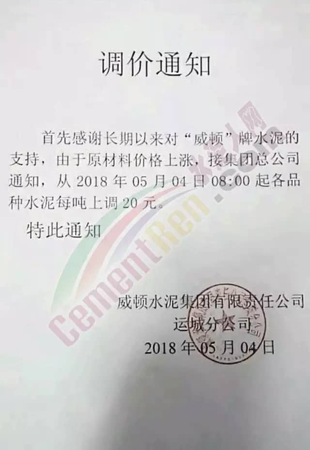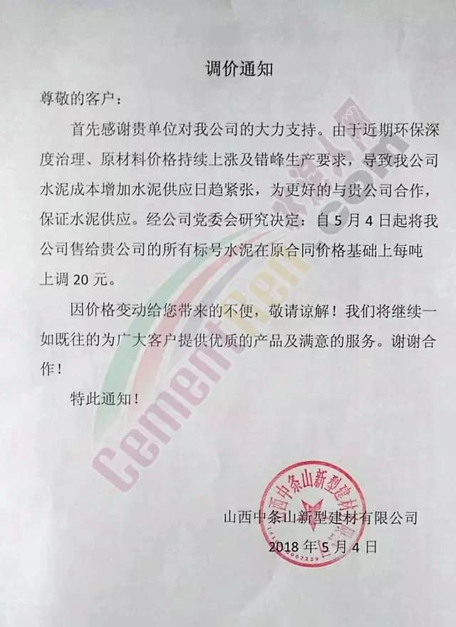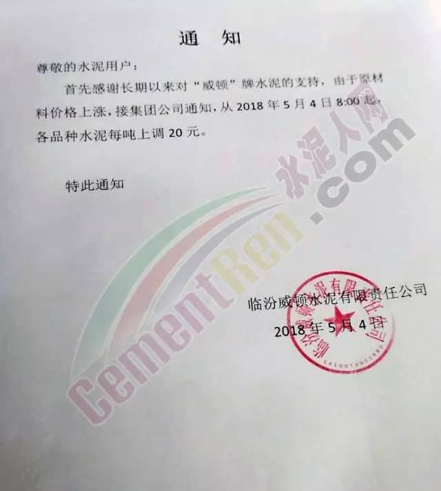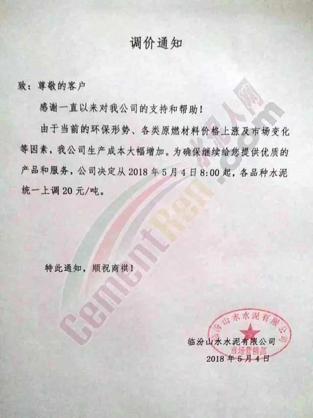 水泥人網(wǎng)5月4日消息,山西南部地區(qū)(晉南)多家企業(yè)通知下游客戶各標(biāo)號(hào)水泥在原價(jià)格基礎(chǔ)上上調(diào)20元/噸。