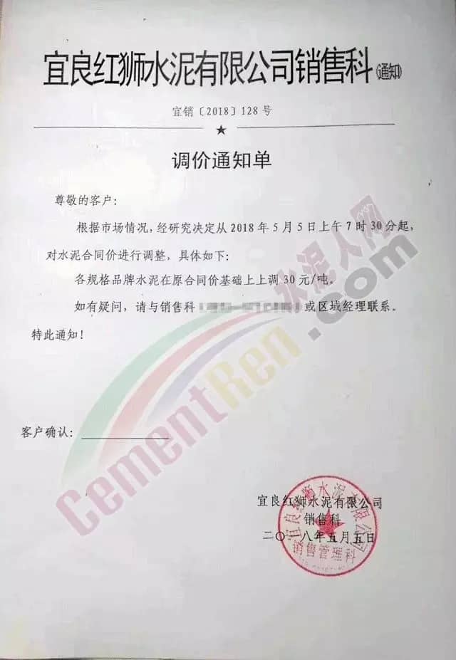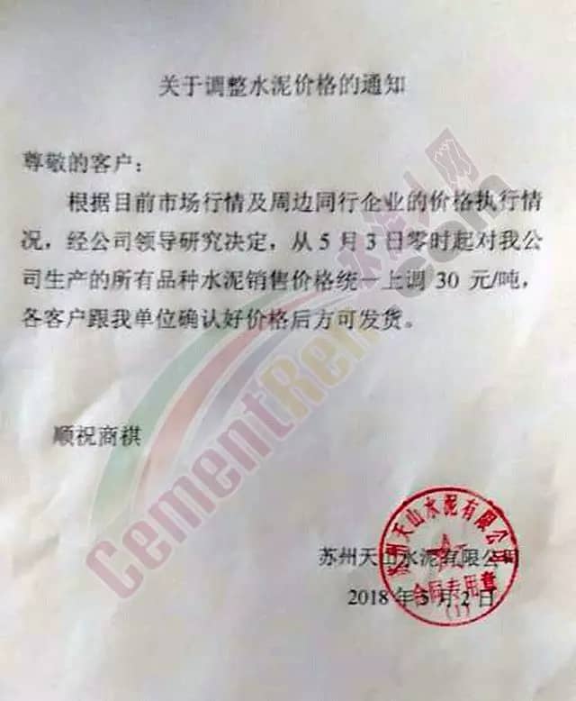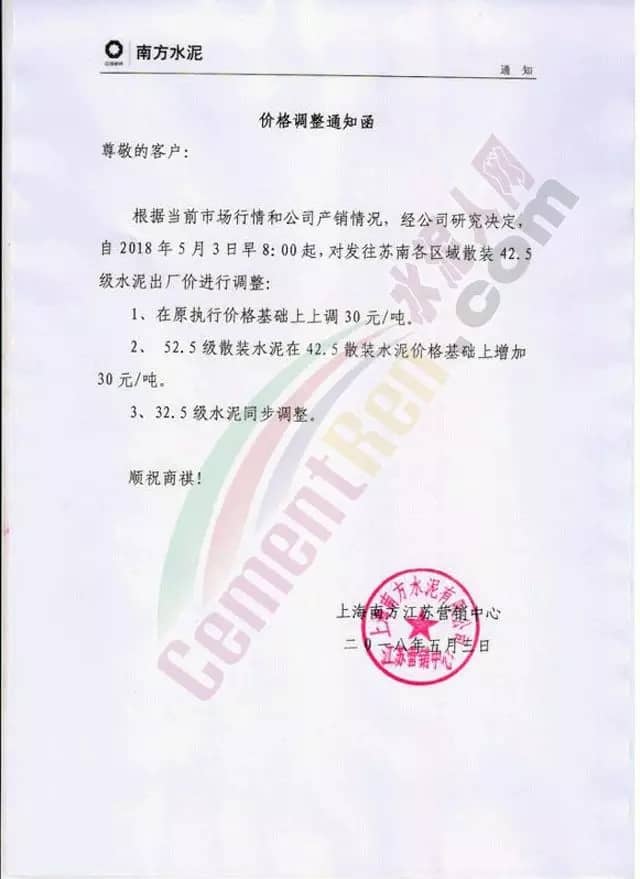 華東蘇南區(qū)域于5月3日上調(diào)水泥價(jià)格,漲幅在30元/噸。其中上海南方水泥江蘇營(yíng)銷中心發(fā)布通知稱,根據(jù)市場(chǎng)行情和公司產(chǎn)銷情況,發(fā)往蘇南各區(qū)域散裝42.5水泥出廠價(jià)在原執(zhí)行價(jià)格基礎(chǔ)上上調(diào)30元/噸 。