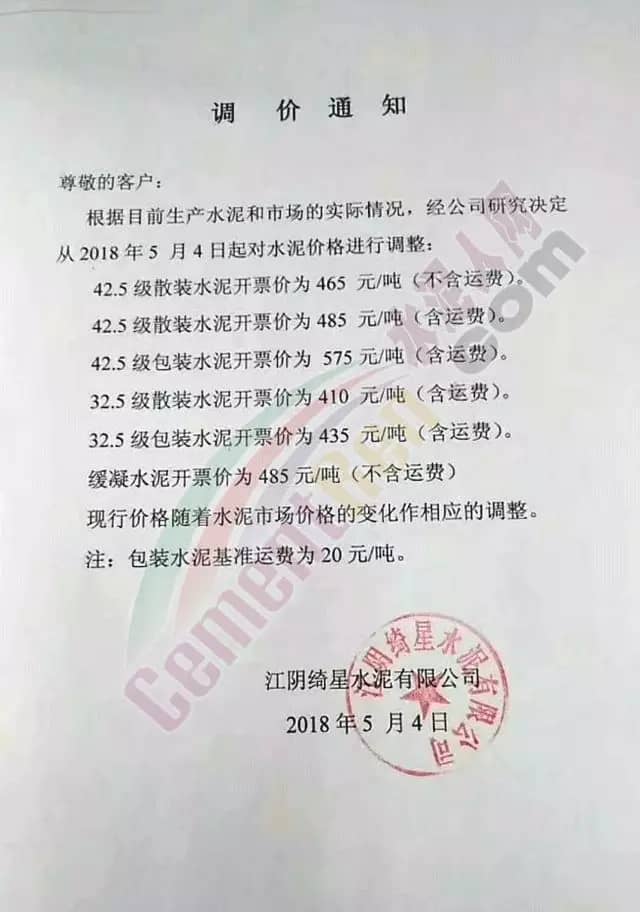 江陰綺星水泥有限公司5月4日調(diào)價(jià)通知顯示 ,42.5級(jí)袋裝水泥開票價(jià)為575元/噸(含運(yùn)費(fèi))。 據(jù)查詢,江陰綺星水泥有限公司位于江蘇省江陰市云亭鎮(zhèn)綺山,為單體粉磨站企業(yè),關(guān)鍵設(shè)備為Φ3.8×13m水泥磨1臺(tái)。