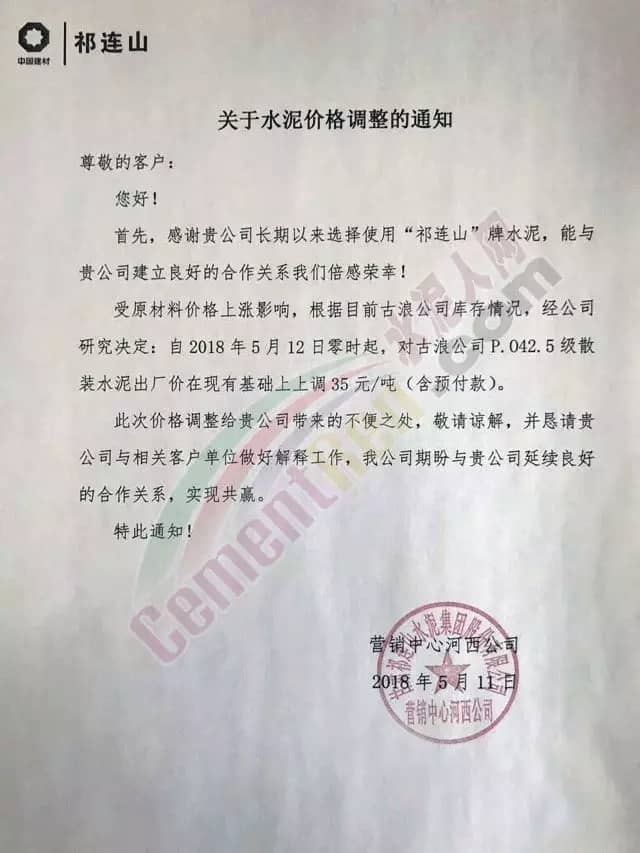 甘肅古浪祁連山水泥價(jià)格調(diào)整通知稱:受原材料價(jià)格上漲影響,根據(jù)目前祁連山水泥古浪公司庫存情況,公司研究決定,自5月12日零時(shí)起,對(duì)古浪公司P.O42.5級(jí)散裝水泥出廠價(jià)上調(diào)35元/噸(含預(yù)付款)。