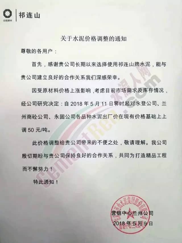 祁連山水泥針對(duì)蘭州區(qū)域的下游客戶發(fā)出通知稱,因受原材料價(jià)格上漲影響,考慮目前市場需求及庫存情況,經(jīng)公司研究決定,自5月11日零時(shí)起對(duì)永登公司、蘭州商砼公司、永固公司各品種水泥出廠價(jià)在現(xiàn)有價(jià)格基礎(chǔ)上上調(diào)50元/噸。