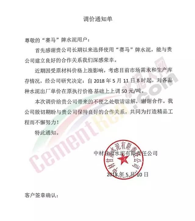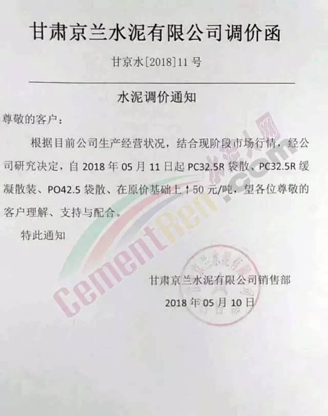 中材甘肅水泥有限責(zé)任公司調(diào)價(jià)通知稱,近期因受原材料價(jià)格上漲影響,考慮目前市場需求和生產(chǎn)庫存情況 ,經(jīng)公司研究決定 自5月11日8時(shí)起,對(duì)各品種水泥出廠單價(jià)在原執(zhí)行價(jià)格基礎(chǔ)上上調(diào)50元/噸。