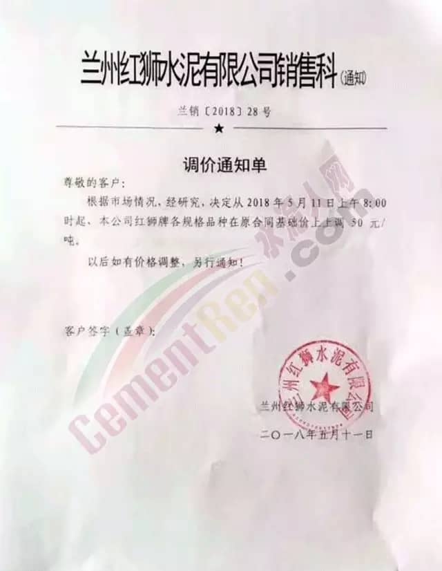 蘭州紅獅水泥有限公司調(diào)價(jià)通知稱,根據(jù)市場情況,經(jīng)研究決定從5月11日上午8點(diǎn)起,紅獅牌各規(guī)格品種在原合同基礎(chǔ)價(jià)上上調(diào)50元/噸。